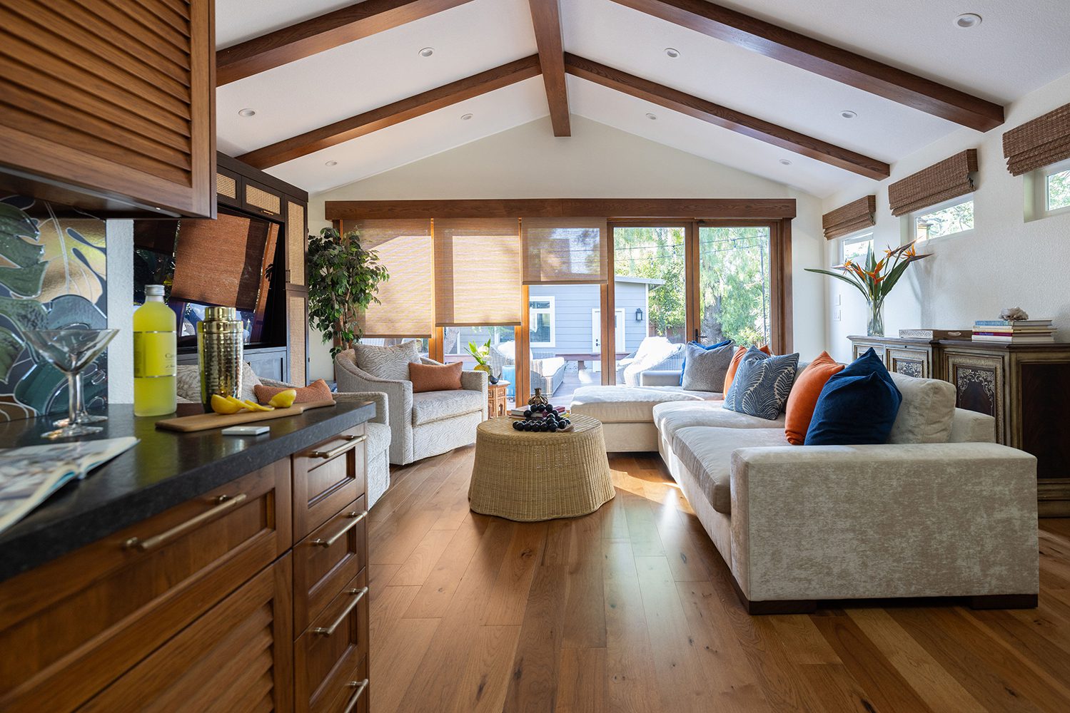 This Silicon Valley couple had big plans to transform their home, starting with a complete first-floor remodel. The biggest change? Turning their attached garage into a brand-new family room. They also had a few key goals: make the backyard easier to access since they love hosting, bring in a resort-style vibe inspired by their love for all things Hawaiian, and add a guest suite on the ground floor with a bedroom and bath—perfect for visitors and future aging-in-place needs. The challenge? Creating a smooth, cohesive flow in a house that had already been through four previous additions.