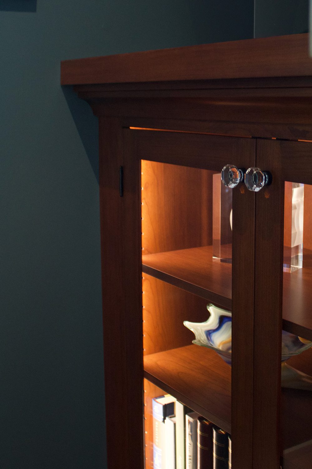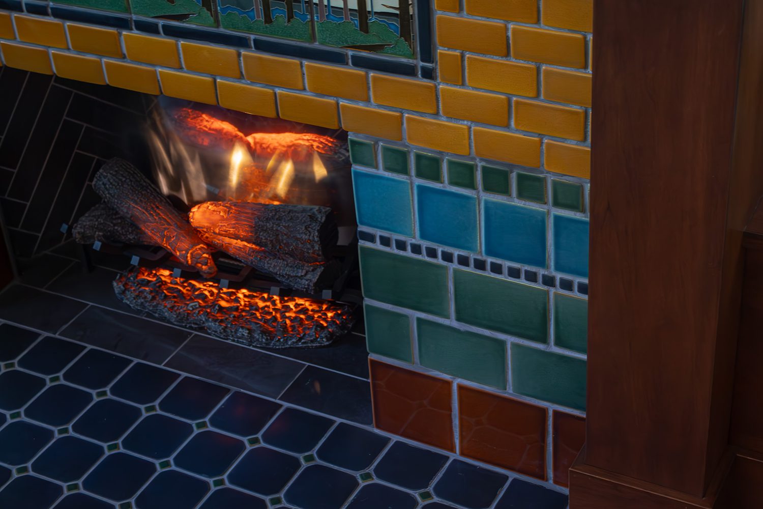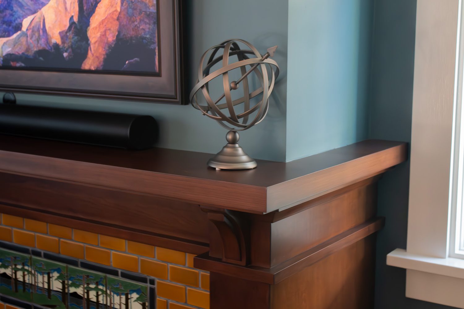 The reimagined fireplace façade makes full use of its 6-foot-wide wall, framed by a built-in bookcase and bench seat. Both feature the same cherry wood as the mantle, creating a cohesive, seamless look. The homeowners worked closely with the designer, Shelly Yoder, to craft a custom Craftsman-style tile design, using handcrafted ceramic tiles in earthy tones that add a natural warmth and timeless character to the space.